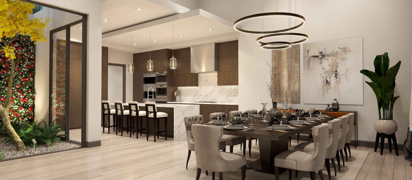 Inspired by mid-century modern architecture, this home situated on ten acres in the equestrian community of Palm Beach Point is the first modern style in the area. Shifting roof planes with intersecting stone walls and large glass panels are blended in a new way to reflect clean lines. Natural materials, an internal green atrium and floating stairs over a reflecting pool are part of the entry features. The home has been raised on the lot five feet to create a floating pool deck at the rear with a dramatic corner vanishing edge that overlooks a riding arena.